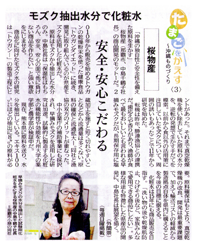 平成24年度ものづくり中小企業・小規模事業者試作開発支援補助金を受け、 肌にやさしい沖縄もずく化粧水 口コミでも人気になりつつあります。沖縄もずくを使った肌にやさしい化粧水を開発中です。乾燥・ニキビなど、肌トラブルの悩みを抱えているかたは、もしかすると